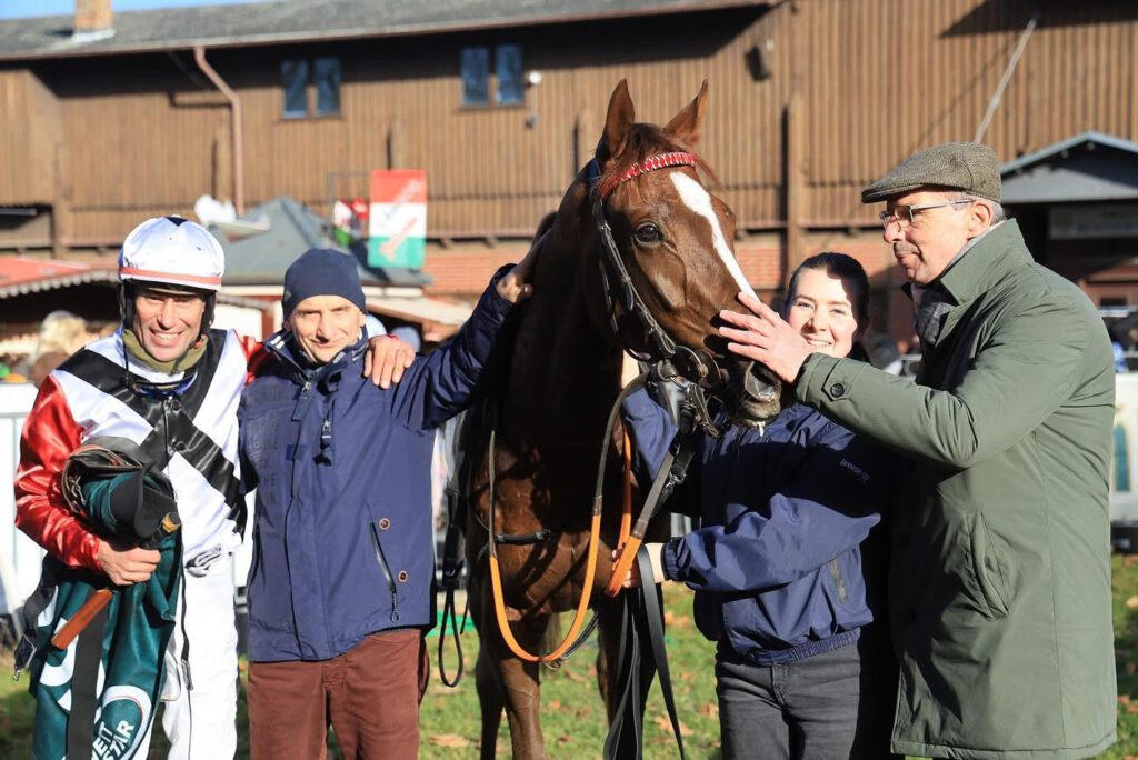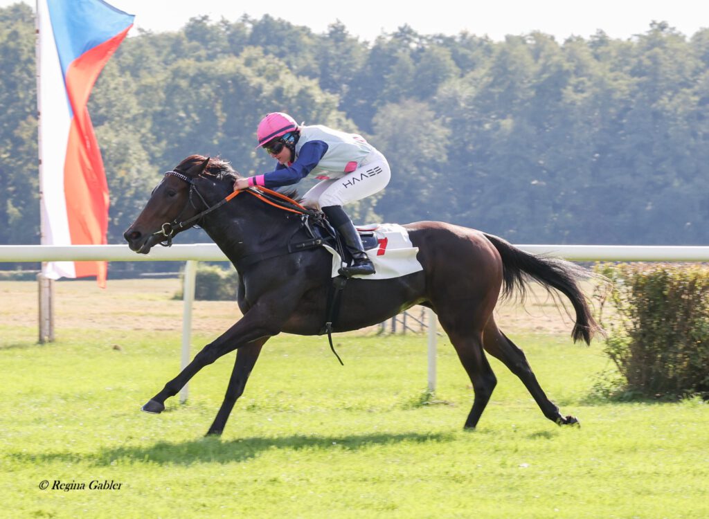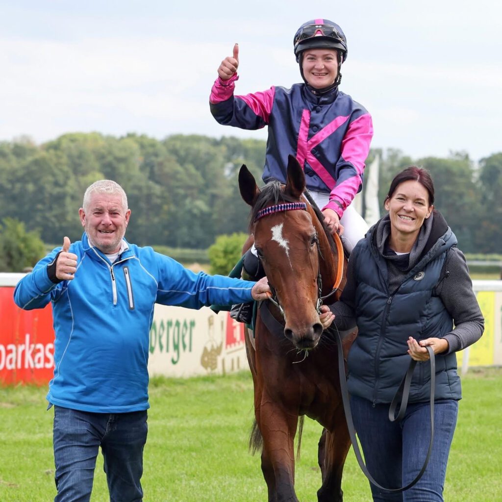 Und dann kam unser „Professor“ Sky Emperor. Nachem er 2024 sage und schreibe 8 x als 2. über die Ziellinie ging, und er auch in diesem Jahr bei 5 Starts wieder 2 mal platziert war, sollte der 6. Jahrestart zu einem Volltreffer werden. Mit Lilli- Marie Engels gewann er leicht. Es war sein 7. Sieg in seiner Karriere